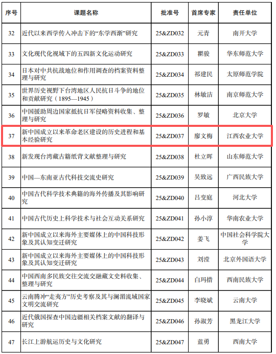 近日,全国哲学社会科学工作办公室公布了2025年国家社会科学基金重大项目立项名单。我校廖文梅教授作为首席专家申报的课题《新中国成立以来革命老区建设的历史进程和基本经验研究》(25&ZD037)成功获得立项,这是我校获得的首个国家社科基金重大项目,实现了学校在国家社科基金重大项目的突破。